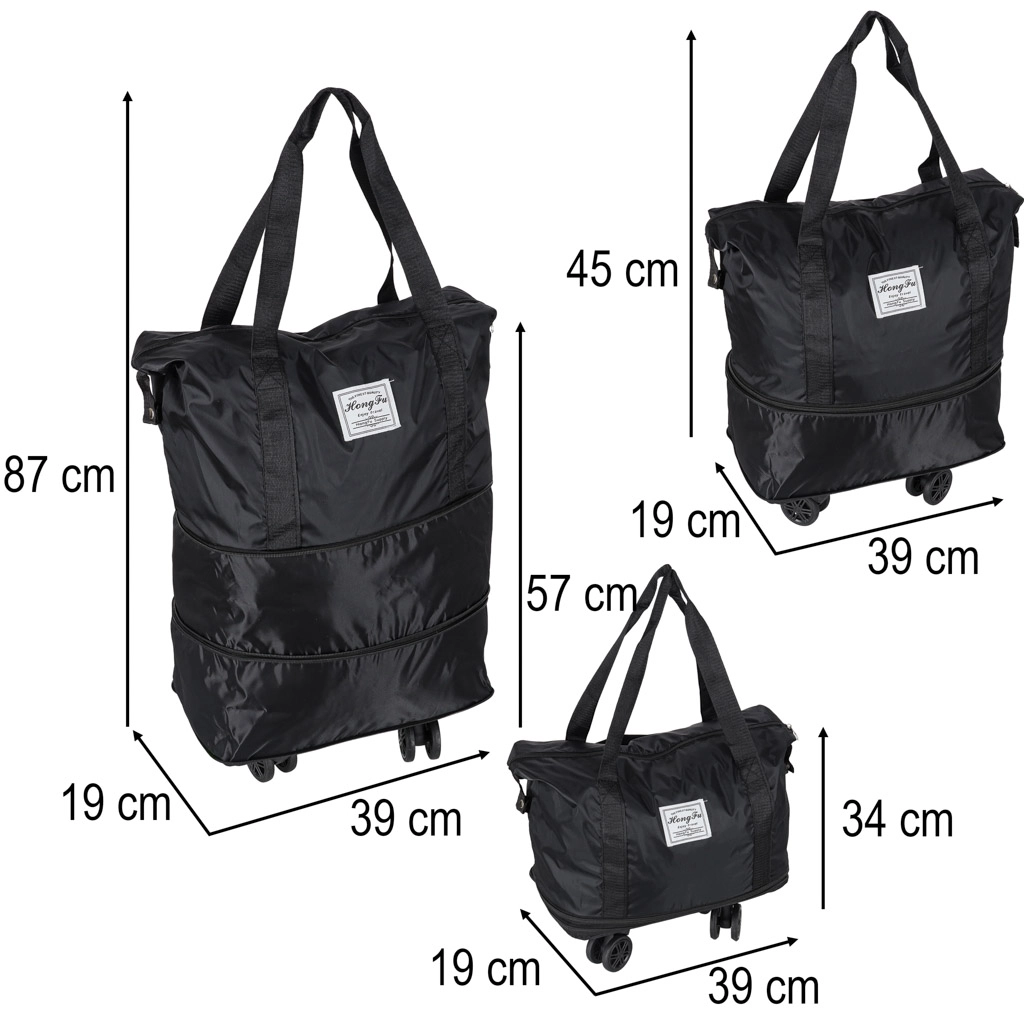 Praktisk sammenklappelig rejsetaske på hjul til weekendture og længere rejser. Den tilbyder op til tre udvidelsesniveauer, volumen omkring 50 liter, vandafvisende Oxford-polyester, 360° drejehjul og robust lynlås. Takket være de aftagelige hjul og den gennemtænkte indvendige inddeling er den ideel til nem pakning og let håndtering.