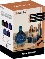 RUHHY er 3-i-1: luftfugter, aromadiffuser og dekorativ LED-lampe. Takket være ultralydsteknologi arbejder den stille og effektivt uden opvarmning af vand – ideel til soveværelse, stue og kontor. Et spejlet dæksel, kompakte mål og silikonefødder giver stabilitet og stil i enhver indretning.