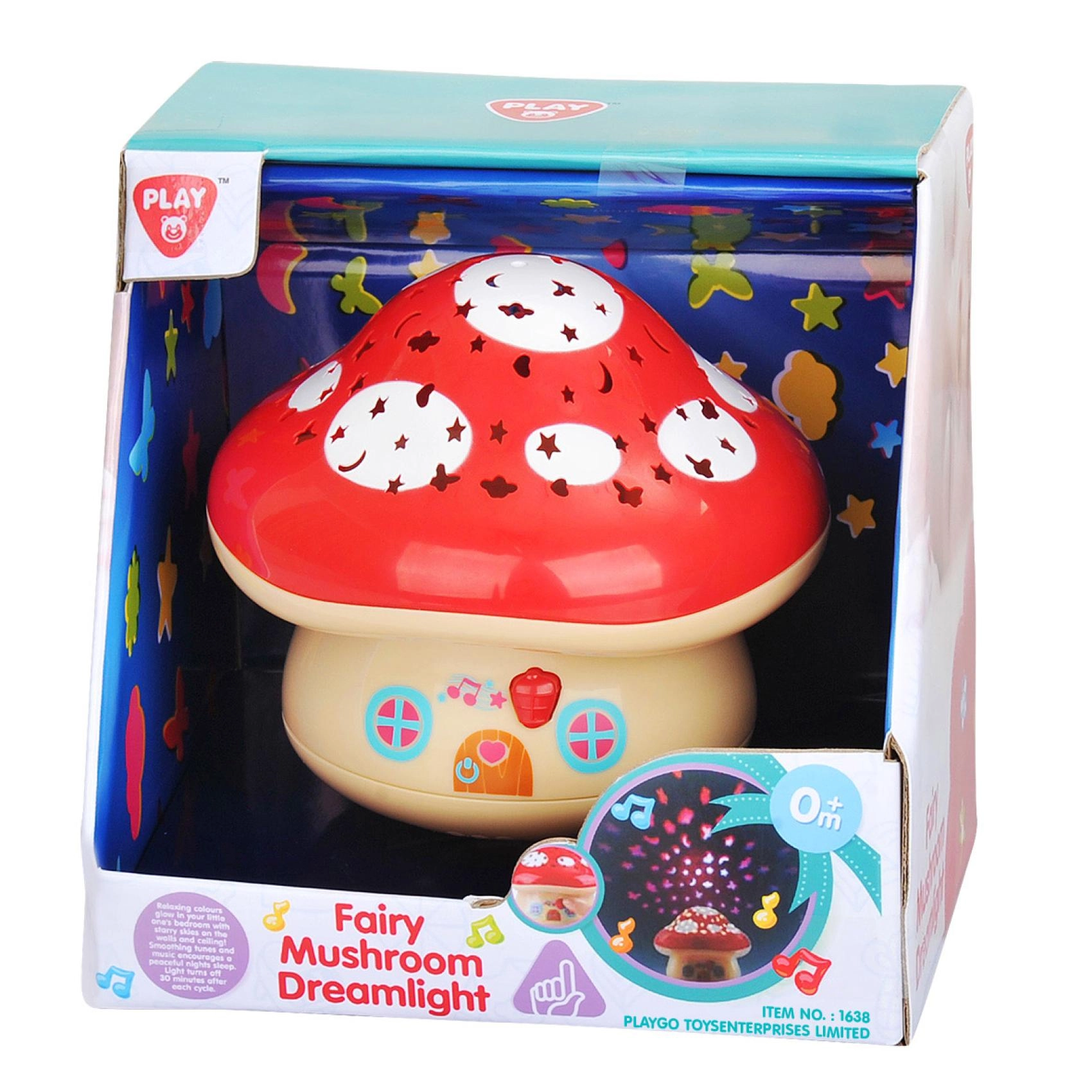Den søde projekterende svamp kaster farvede former og stjerner på vægge og loft, ledsaget af beroligende melodier for en rolig indsovning. Automatisk slukning efter 30 minutter sparer batteri, og stille projektion og blidt lys skaber en behagelig stemning på børneværelset. Ideel fra fødslen (0m+).
