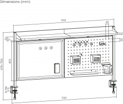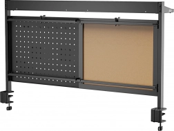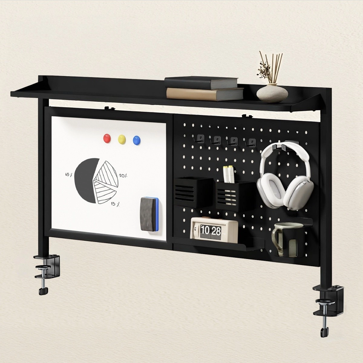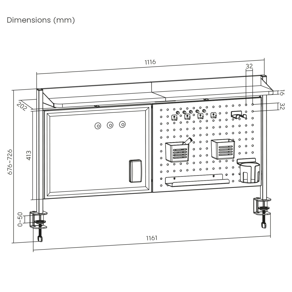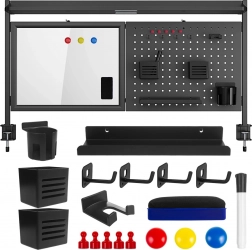 Denne multifunktionelle overbygning forvandler ethvert bord til en overskuelig og effektiv arbejdszone. Den stabile fastgørelse med metalliske C-klemmer sparer plads og kræver ingen boring. Den magnetiske whiteboard-tavle er ideel til hurtige noter, opgaver eller idéer, som let tørres af med den medfølgende svamp, og det perforerede panel giver fri mulighed for at omplacere holdere og kurve efter behov.