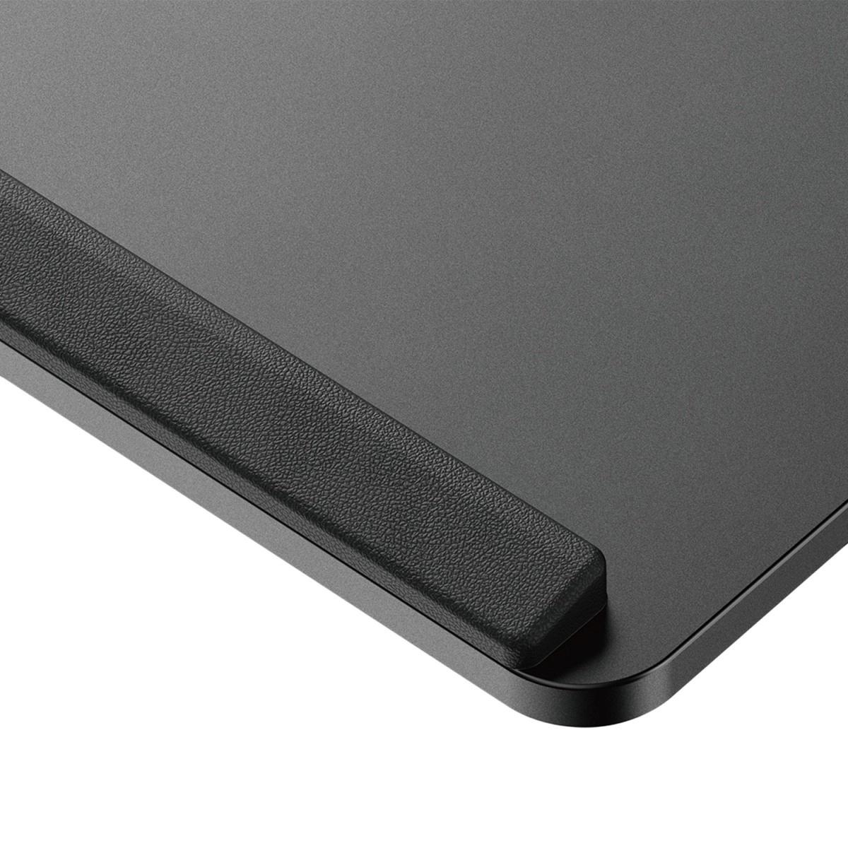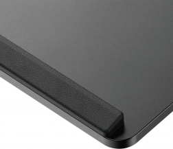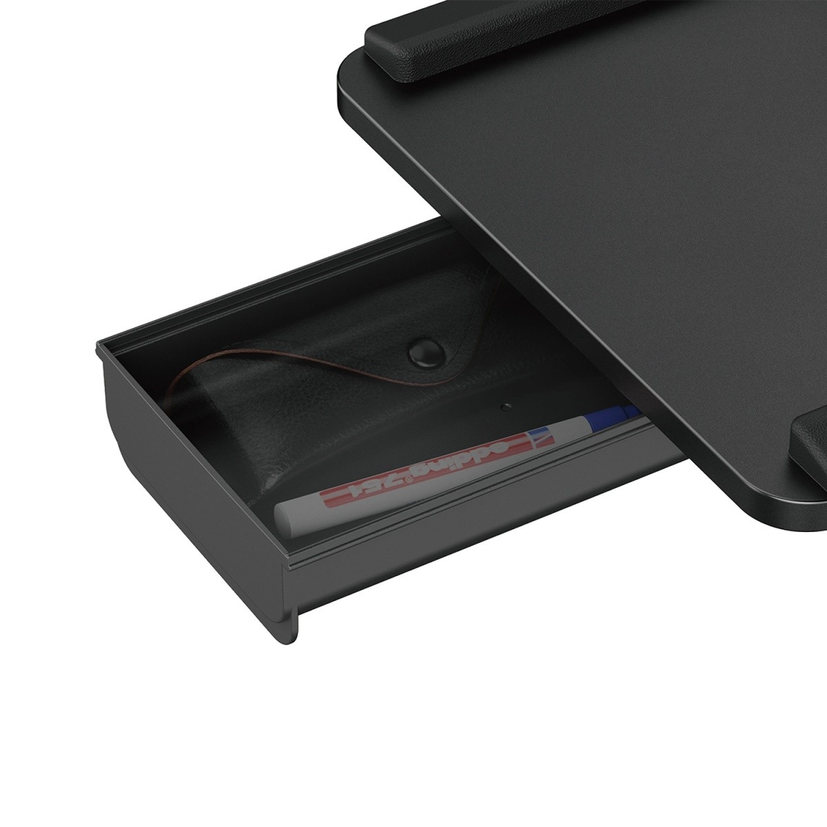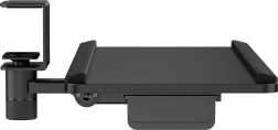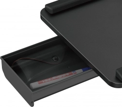 Den integrerede udtrækkelige sidebakke rummer småt tilbehør, og de forhøjede kanter rundt om forhindrer, at tastatur eller mus falder ned.