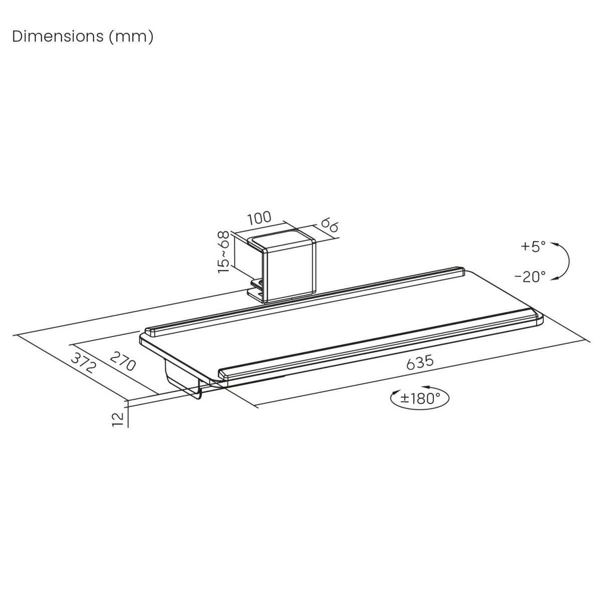 Den generøse arbejdsoverflade rummer både tastatur og mus, mens den praktiske udtrækkelige sidebakke holder småting lige ved hånden. Forhøjede kanter forhindrer, at tilbehør glider af. Montering er hurtig – i pakken finder du skruer, unbrakonøgle og beskyttende puder til en sikker og lydsvag fastgørelse.