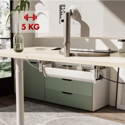 Organisatoren giver mulighed for montering i to højdepositioner for at tilpasse pladsen og udstyret. Hurtig adgang sikres af et bekvemt åbningssystem uden behov for demontering. Det neutrale design i hvid/grå falder diskret ind med de fleste borde og interiører.