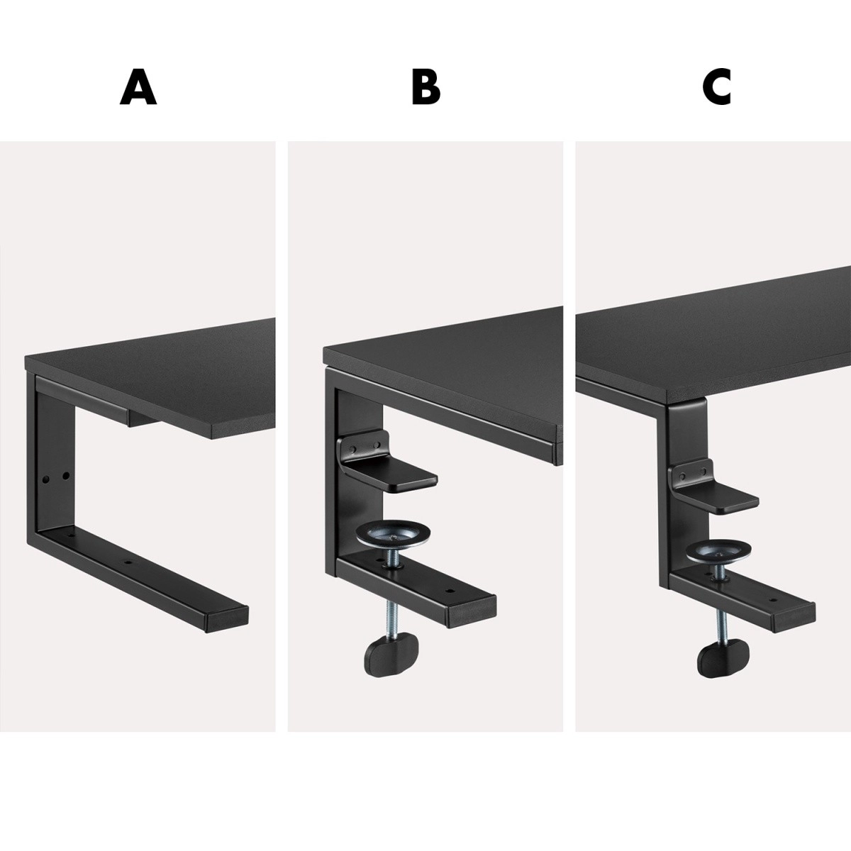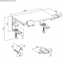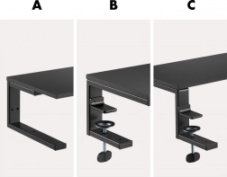 Installationen er hurtig og uden skader på møblerne – et par justerbare tvinger fastgøres solidt til bordpladen (maks. tykkelse ca. 50 mm), mens gummipuder beskytter overfladen mod ridser. Den robuste konstruktion sikrer høj stabilitet selv for tungere enheder op til 20 kg.