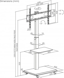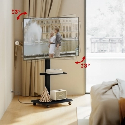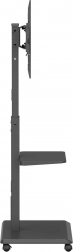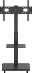 Den brede base med hjul og lås muliggør jævn flytning mellem rum og sikker fastlåsning på stedet. Den praktiske hylde giver plads til tilbehør som afspillere, set-top-bokse eller præsentationsudstyr.