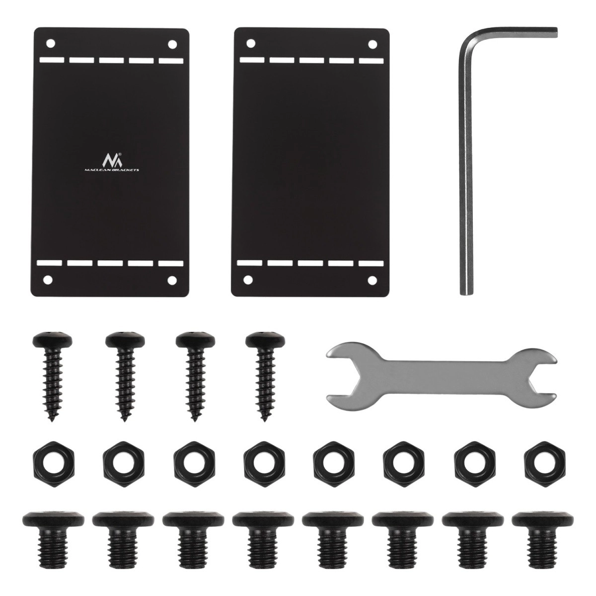 I pakken finder du skruer, møtrikker, nøgle og unbrako – installeringen klarer du hurtigt uden ekstra indkøb.