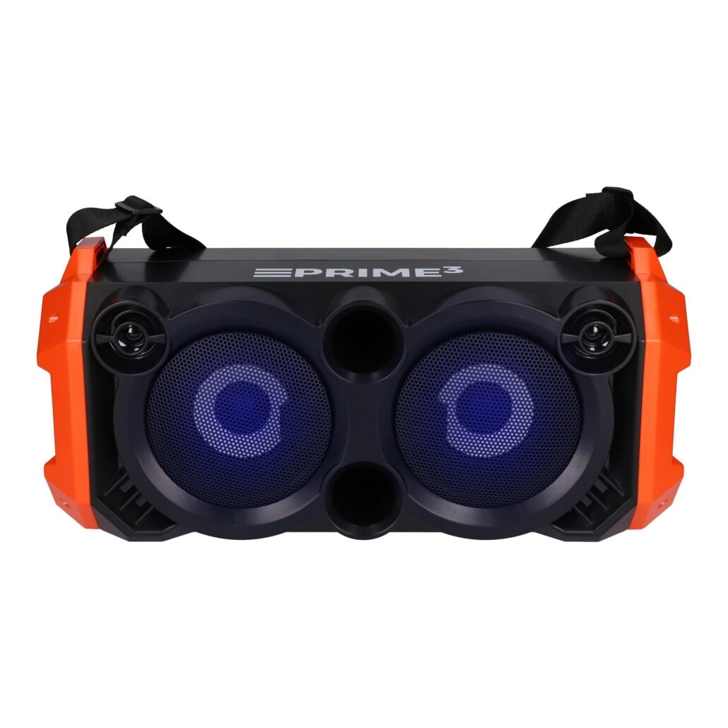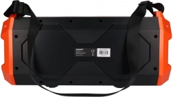 Et praktisk sidepanel med en overskuelig skærm sikrer nem betjening. Det indbyggede batteri på 2000 mAh giver op til 5 timers afspilning og oplades fuldt på cirka 3 timer. Der medfølger en skulderrem for komfortabel transport. Det robuste sorte design med orange detaljer ser stilfuldt og moderne ud.
