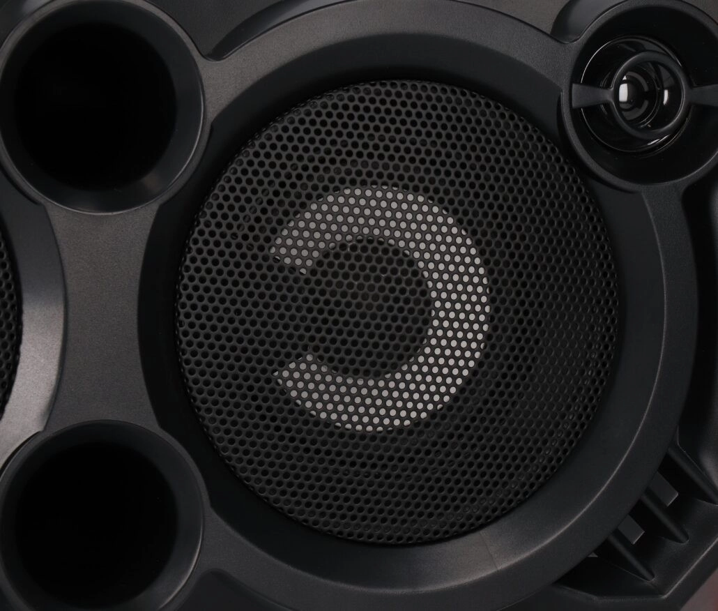 Takket være Bass reflex-konstruktionen og en musikydelse på op til 100 W (3.200 W P.M.P.O.) spiller den højt, fyldigt og med fokus på bas. Equalizeren lader dig justere diskant og bas, så du kan finindstille lyden efter din smag. Karaoke-funktionen med 6,5 mm mikrofonindgang og separat kontrol af echo-effekt sætter gang i enhver fest, som understreges af multifarvet LED-belysning.