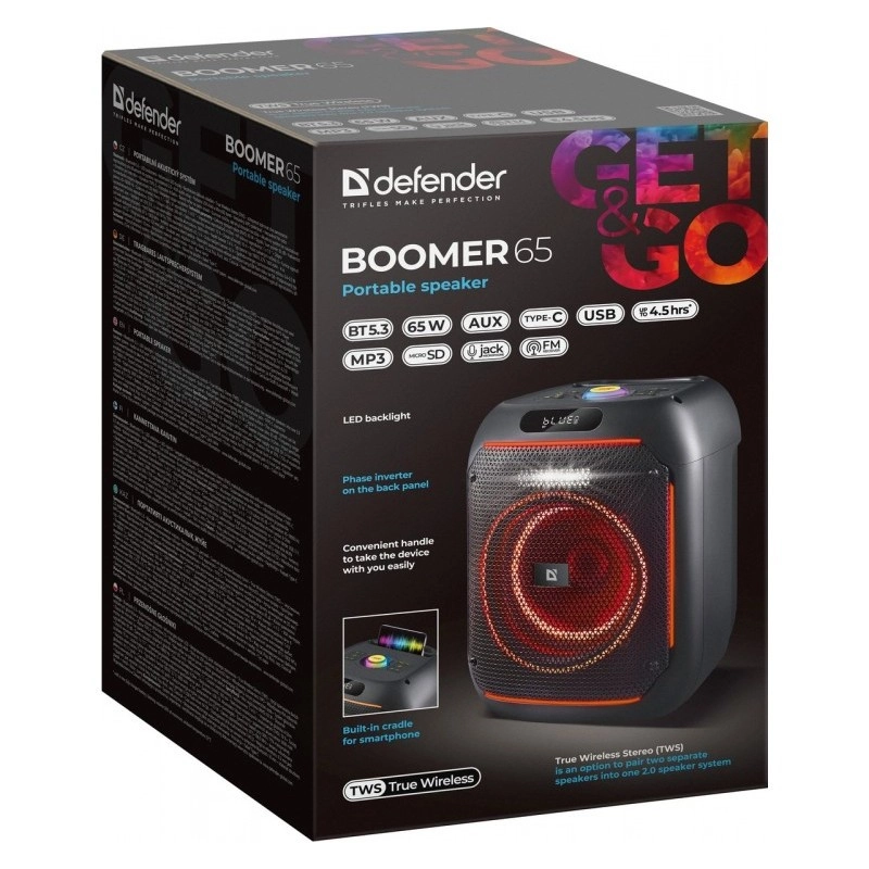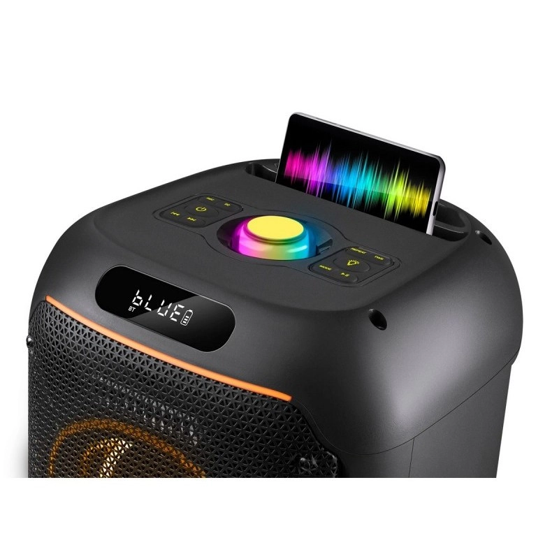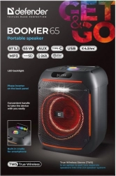BOOMER 65W er en kraftig festhøjttaler, som kombinerer stærk lyd, praktiske funktioner og attraktive lyseffekter. Takket være Bluetooth 5.3 spiller den uden udfald og med lav latenstid, mens den indbyggede MP3-afspiller og FM-radio udvider lyttemulighederne selv uden telefon.