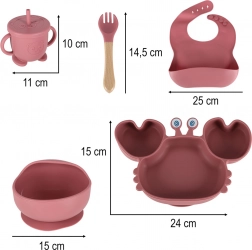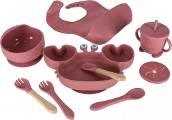 Dette 9-dels sæt i elegant mørk rosa indeholder alt, hvad du behøver til komfortabel og sikker fodring af barnet fra 6 måneder. Den inddelte krabbetallerken og skålen med effektive sugekopper står stabilt på bordet eller højstolen, så spild og rod minimeres. Blød fødevaregodkendt silikone uden BPA er skånsom mod gummer og tænder og er samtidig nem at rengøre.