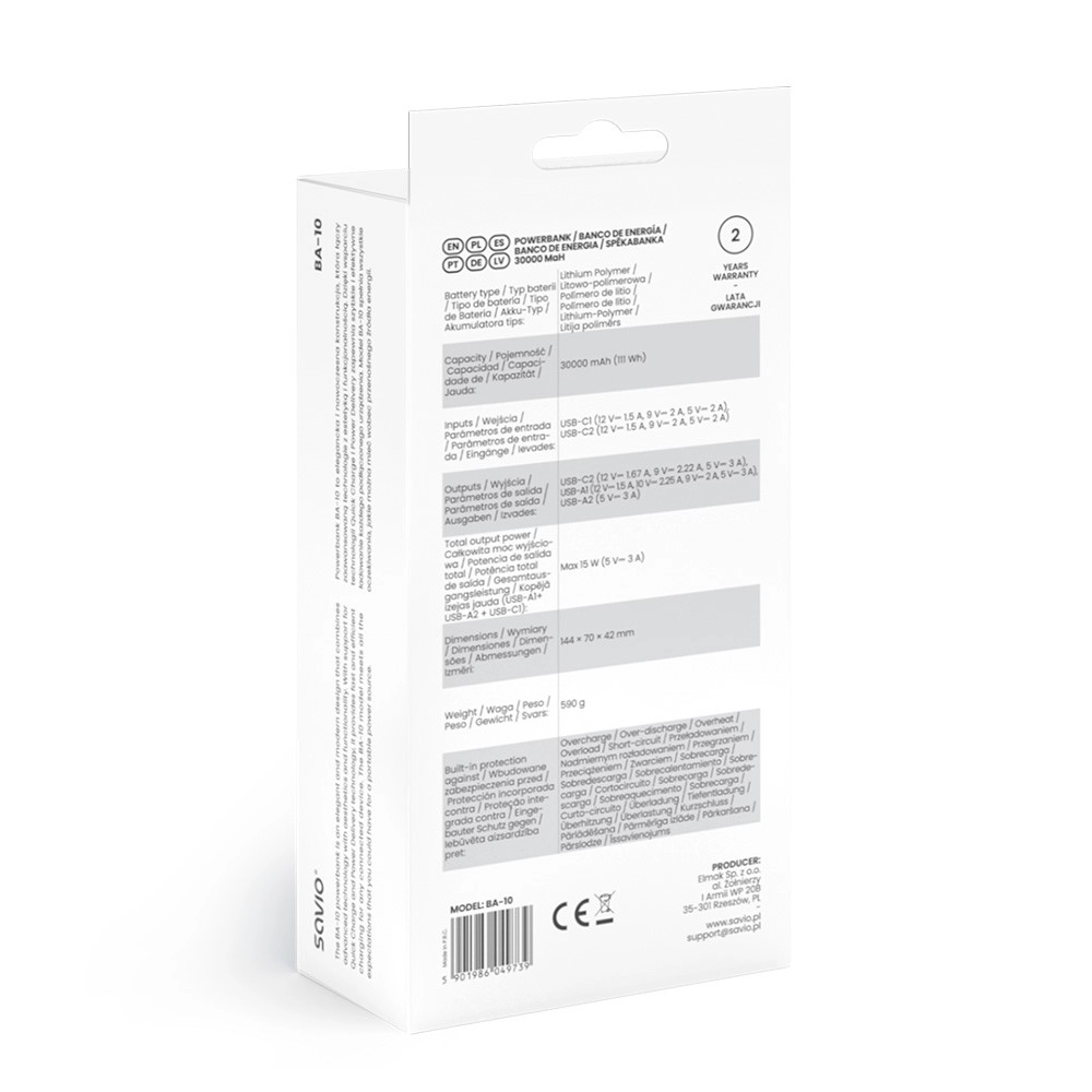 Leder du efter sikker strøm, når som helst og hvor som helst? Denne powerbank med enorm kapacitet 30000 mAh (111 Wh) leverer energi til din telefon, tablet eller dine høretelefoner til flere opladninger uden at være afhængig af en stikkontakt. Et fremragende valg til udflugter, forretningsrejser og daglig pendling.
