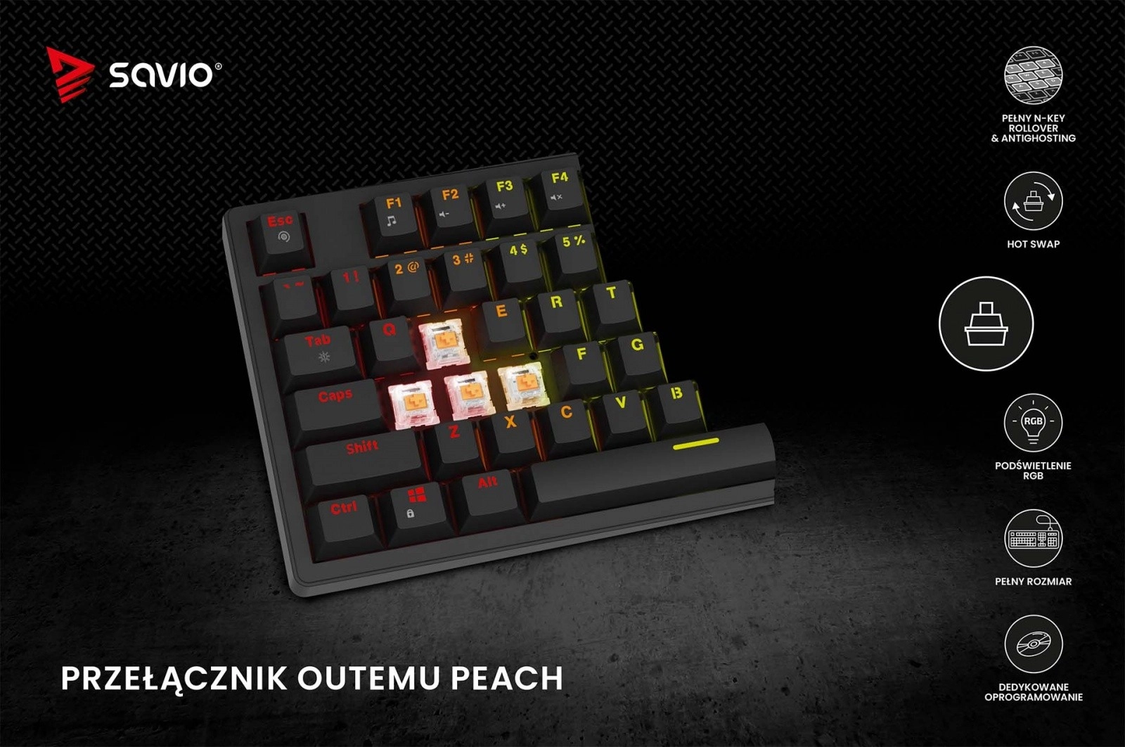 Savio STYX er et fuldstørrelses mekanisk tastatur designet til gamere og krævende professionelle. De stille lineære kontakter OUTEMU PEACH SILENT med indbyggede dæmpere sikrer bløde tastetryk, minimal støj og komfort selv under lange skrivepas eller nattespil. Takket være hot‑swap‑sokler kan du nemt udskifte kontakter uden lodning og tilpasse responsen præcist til dine præferencer.