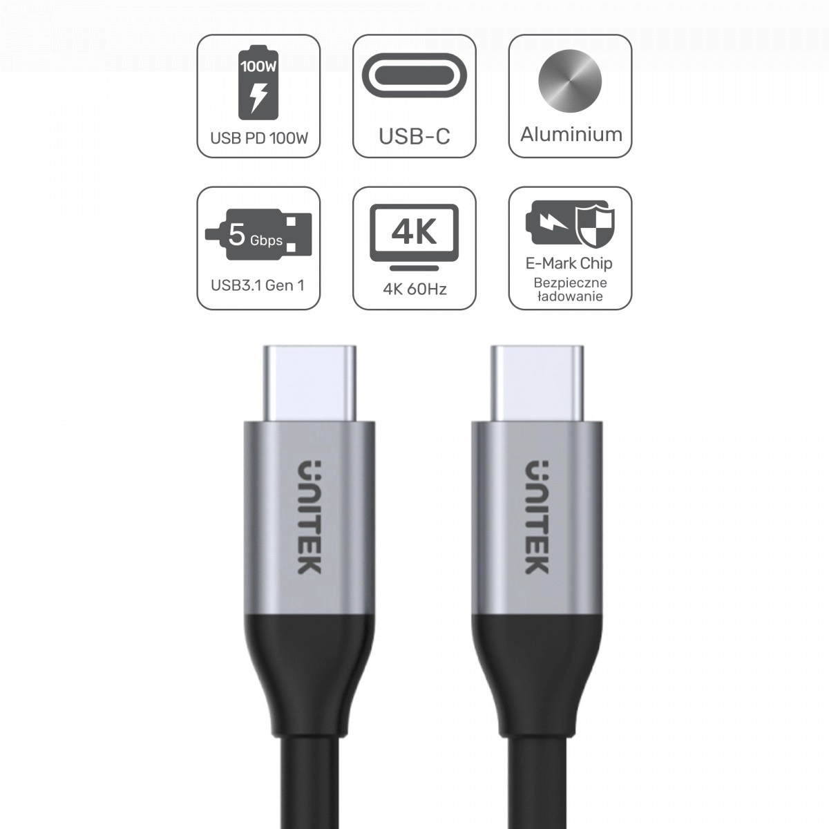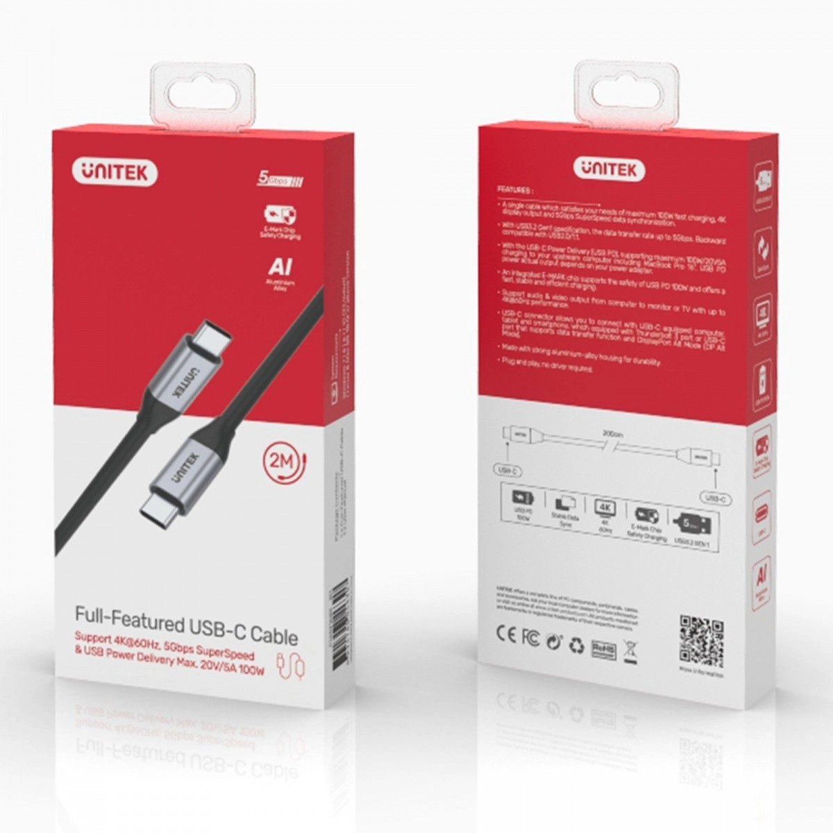 Robuste aluminiumsendestykker og en integreret E‑MARK‑chip vælger automatisk sikre strømparametre, så opladning og synkronisering er hurtig og pålidelig. Længden på 2 m giver komfortabel rækkevidde hjemme, på kontoret og på farten – fra tilslutning af en laptop til en 4K‑skærm til tilkobling af en telefon til et TV.
