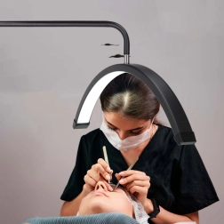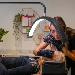Den buede LED-lyshoved (64 cm) oplyser arbejdsområdet jævnt uden skarpe skygger – ideel til detaljearbejde ved vipper, bryn og negle.