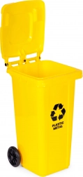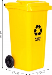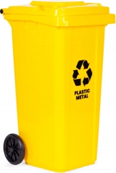 Robust gul skraldespand med en kapacitet på 120 l til sortering af plast og metal. Fremstillet af UV‑bestandig HDPE, med gummihjul, ergonomiske håndtag, stabiliserende fødder og tæt låg. Kompatibel med kommunale systemer EN 840, ideel til hjem og virksomheder.