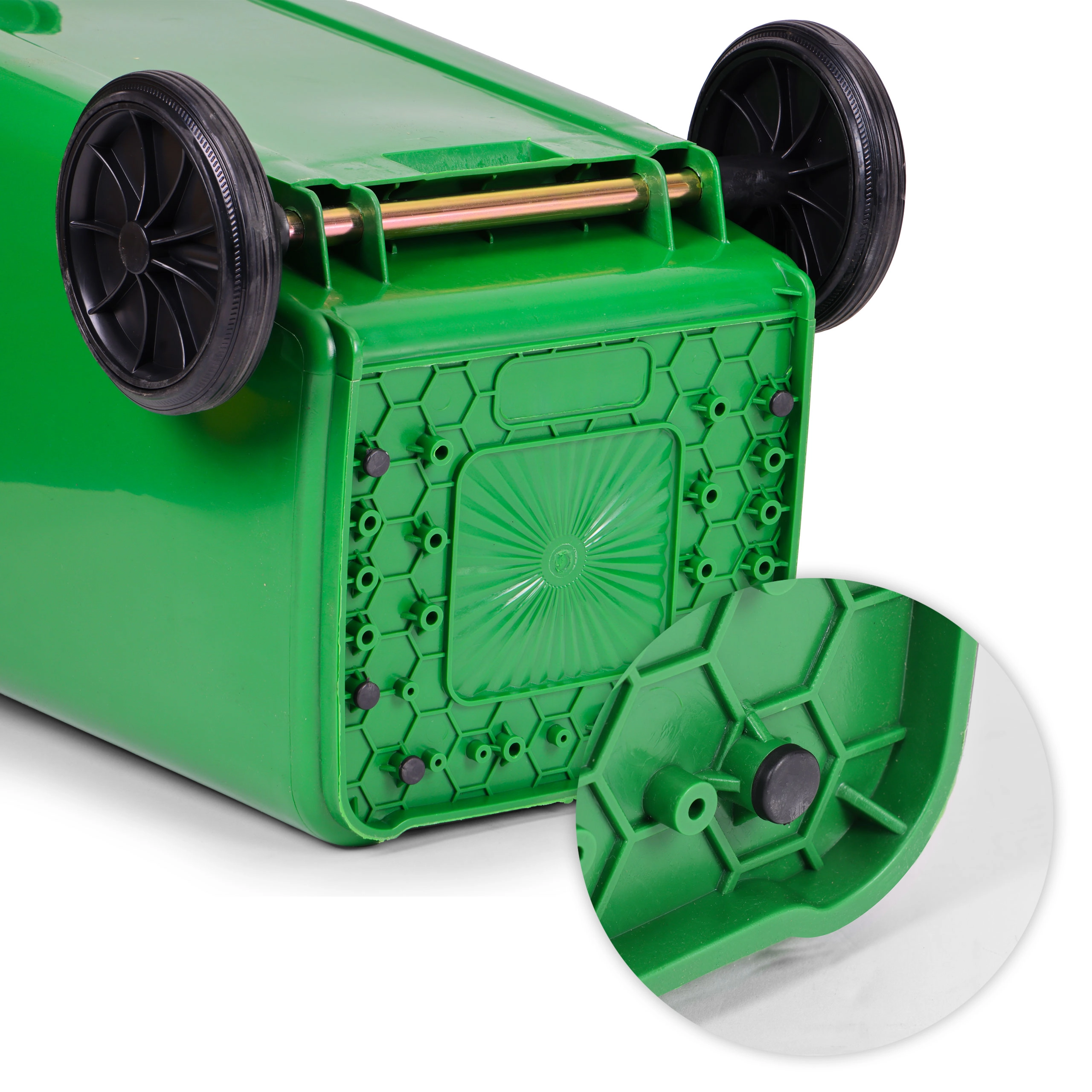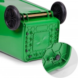 Til nem transport har den gummihjul på metalaksel og ergonomiske håndtag med skridsikker profil. Stabiliserende fødder begrænser bevægelse på våde overflader og beskytter gulvet mod ridser. Beholderen er fuldt kompatibel med kommunale indsamlingsbiler i henhold til EN 840 og opfylder takket være ISO9001, ISO14001, ISO45001 de høje krav til kvalitet og sikkerhed.