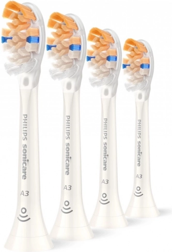 PHILIPS Sonicare A3 All‑in‑One erstatningshoveder er designet til maksimal effektivitet og komfort. Særligt formede børstehårsbundter med trekantet profil øger kontakten med tandens overflade for hurtig fjernelse af pletter, mens længere sidebørstehår plejer tandkødslinjen. Sonisk teknologi overfører den rensende effekt ind i mellemrummene og langs tandkødsranden.