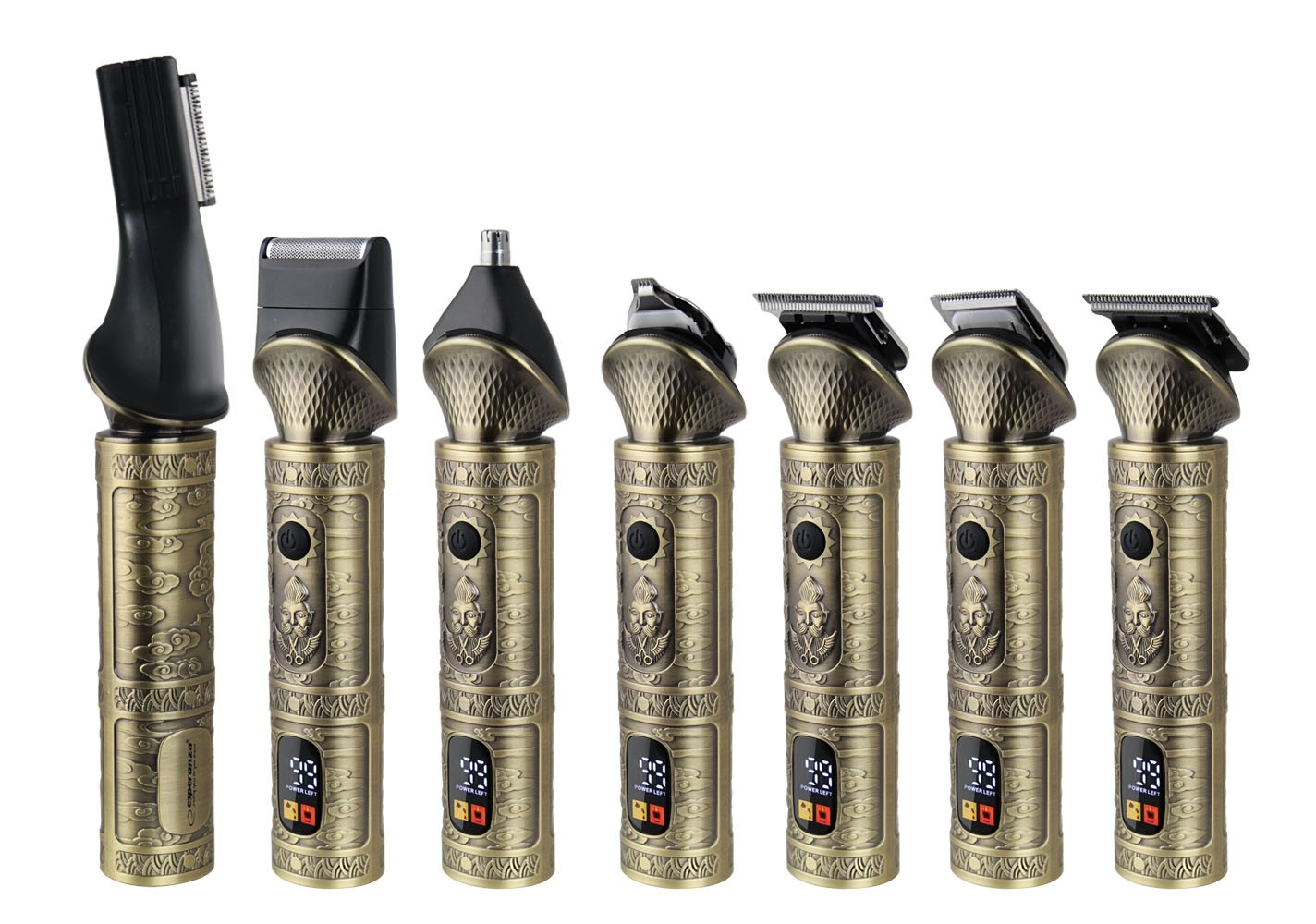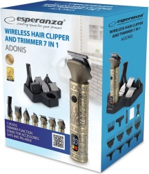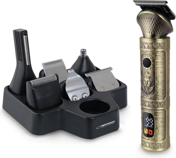 Leder du efter en alsidig trimmer til komplet grooming? ADONIS fra ESPERANZA kombinerer kraft, præcision og frihed uden kabel. 7 udskiftelige hoveder dækker alt fra konturer med T‑klinge og folieshave til detalje- og næse/øre‑trimmer. LCD‑skærmen overvåger batterikapacitet, opladningsforløb og minder om smøring af blade.