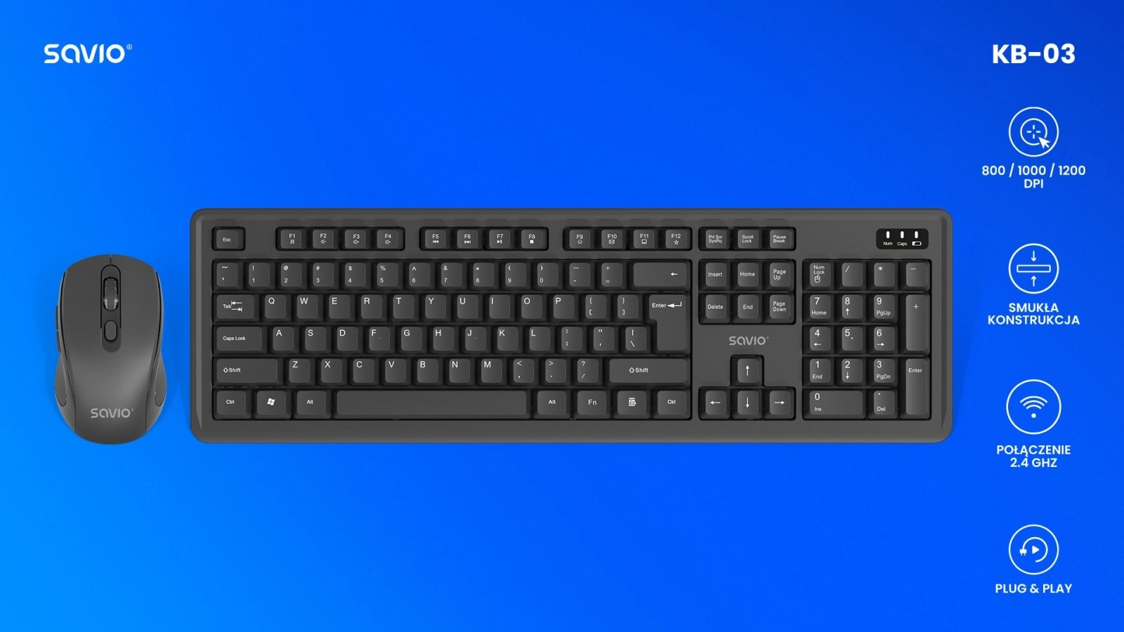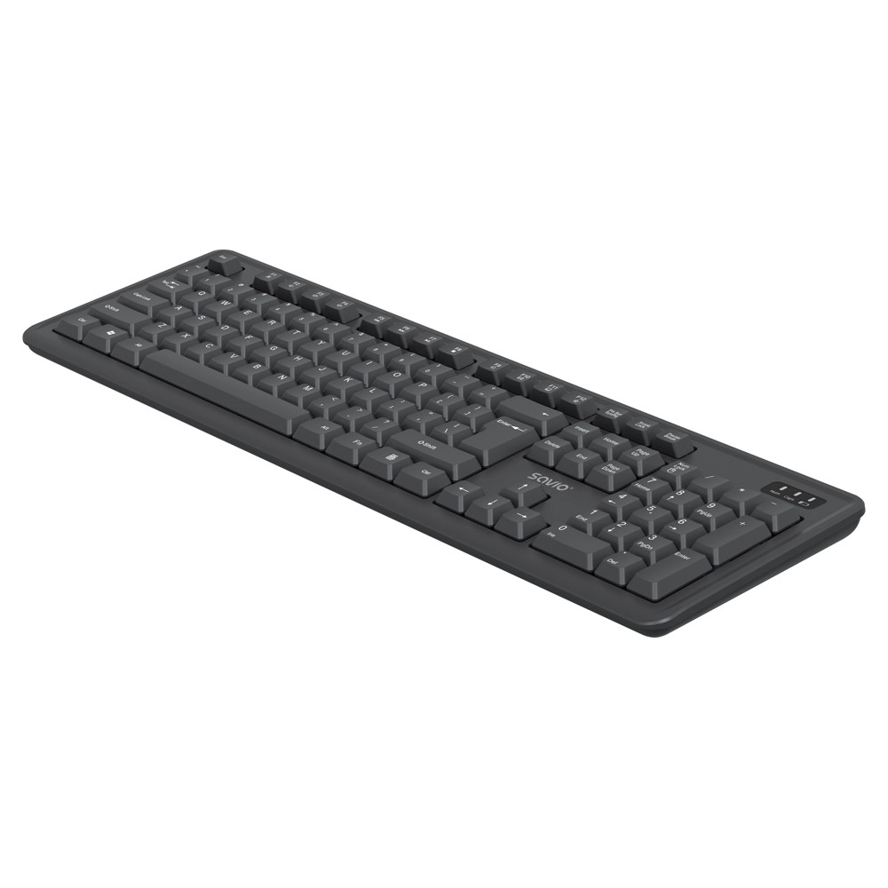 Savio KB-03 er et praktisk trådløst sæt til arbejde derhjemme og på kontoret. Det fuldformaterede tastatur med numerisk blok muliggør komfortabel og præcis skrivning, mens den kompakte mus med ergonomiske kurver ligger godt i hånden. Begge enheder kommunikerer med computeren via én USB-modtager og sikrer pålidelig drift uden kabler.