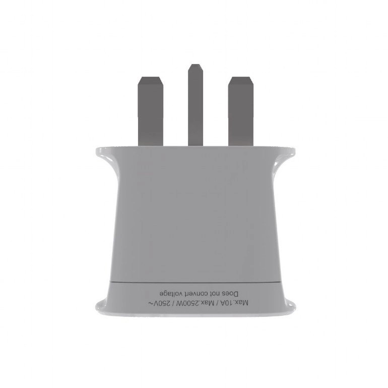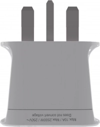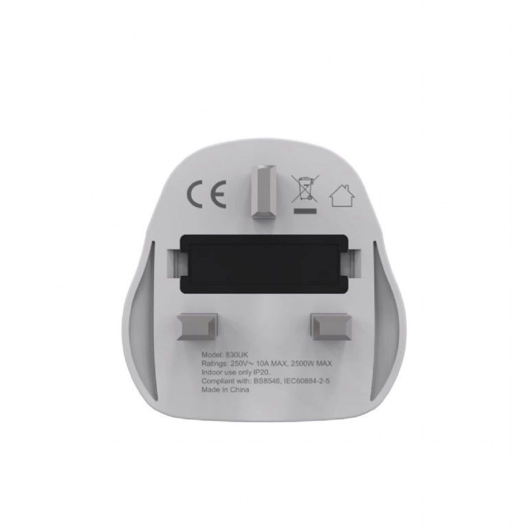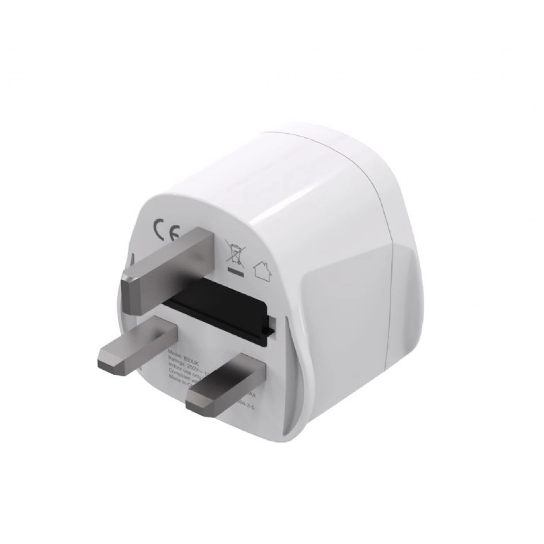 Adapteren er designet til maksimal sikkerhed og kompatibilitet med forskellige stiktyper fra mere end 200 lande. Bemærk: adapteren ændrer ikke spændingen – kontroller før brug, at din enhed understøtter 230 V / 50 Hz, som anvendes i Storbritannien.