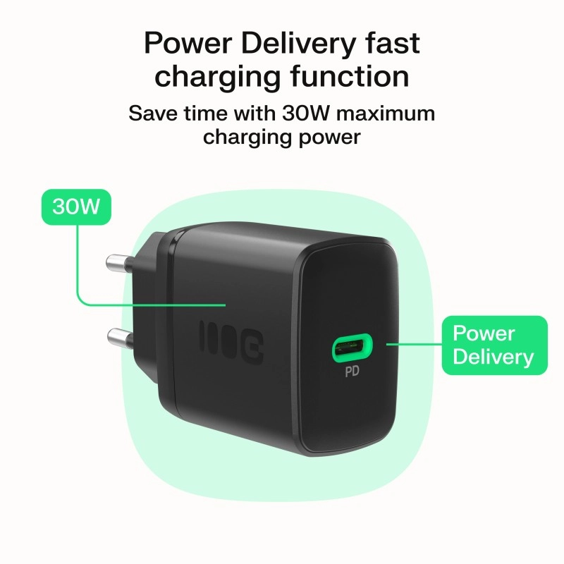 Nyd hurtig og sikker opladning med 30 W effekt og USB‑C Power Delivery. Opladeren kan lade din telefon op til omkring 80 % på cirka 40 minutter, så du venter mindre og når mere. Takket være de kompakte mål er den ideel til hjemmet, kontoret og på farten.