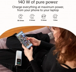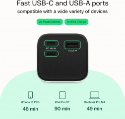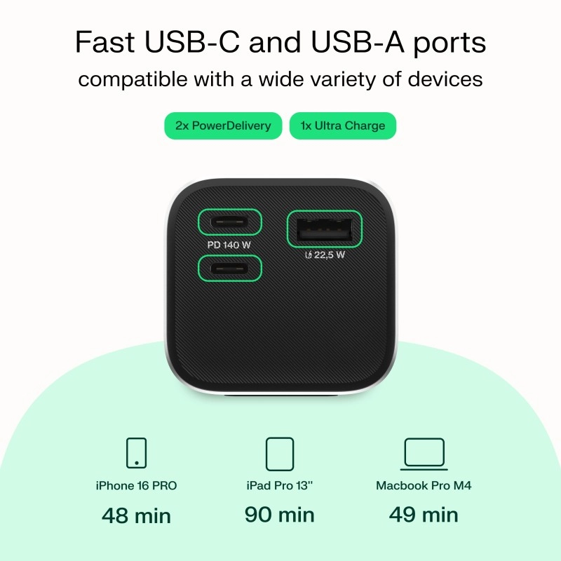 Udgangseffekt op til 140 W med Power Delivery klarer hurtigt at oplade kompatible ultrabooks og mere krævende enheder – endda samtidig.