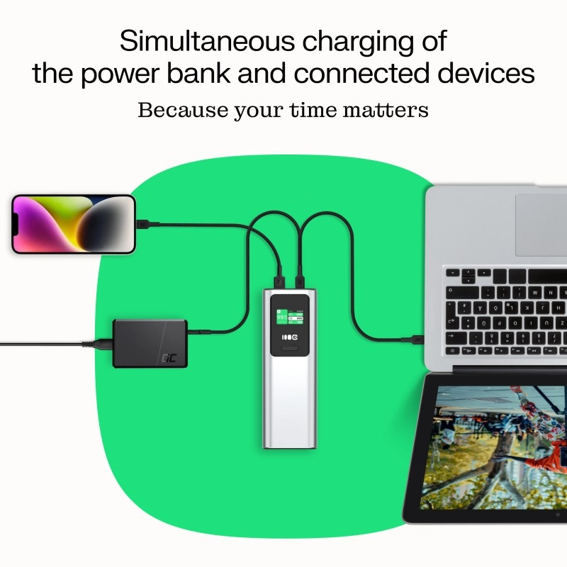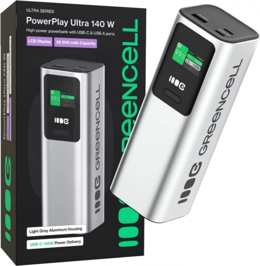 Leder du efter en erstatning for stikkontakten på farten? Powerbanken GREEN CELL PowerPlay Ultra kombinerer en enorm kapacitet på 25200 mAh og ultrahurtig opladning på 140 W PD, så den kan forsyne to bærbare samtidig og oplade din smartphone eller tablet flere gange. Takket være USB‑C og USB‑A porte er den kompatibel med en bred vifte af enheder og klar til moderne opladningsstandarder.