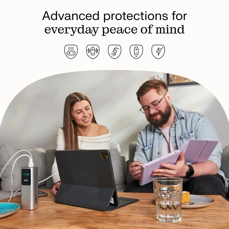 Det integrerede LCD‑display giver nøgledata i realtid: opladningsstatus, aktuel effekt, antal cyklusser, temperatur og reel kapacitet. Pass‑through muliggør opladning af powerbank og enheder samtidigt – det sparer tid og øger komforten. Powerbanken opfylder internationale luftfartsstandarder, så du kan tage den med i flyet.
