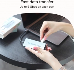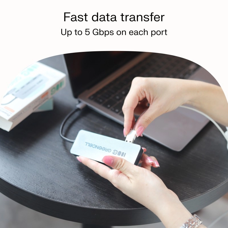 Forvandl én USB‑C-port til fire pålidelige USB‑A 3.0. Tilslut flashdrev, tastaturer, mus og eksterne drev, og arbejd bekvemt uden konstant omkobling. Hver port leverer datahastighed op til 5 Gb/s for hurtig kopiering og synkronisering.