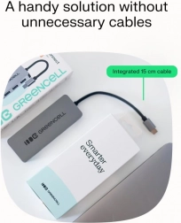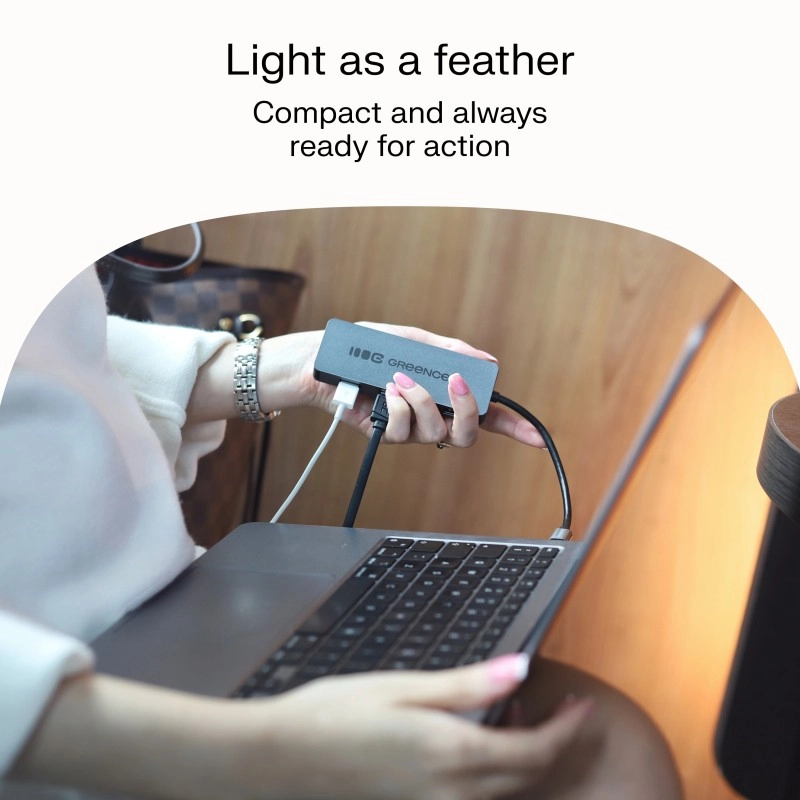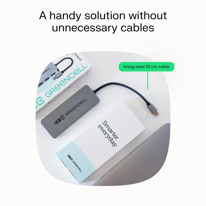 Det kompakte aluminiumschassis er robust og matcher moderne bærbare perfekt. Det integrerede kabel (15 cm) holder skrivebordet ryddeligt, og hubben passer nemt i lommen eller tasken – ideel til mobil arbejdsbrug.