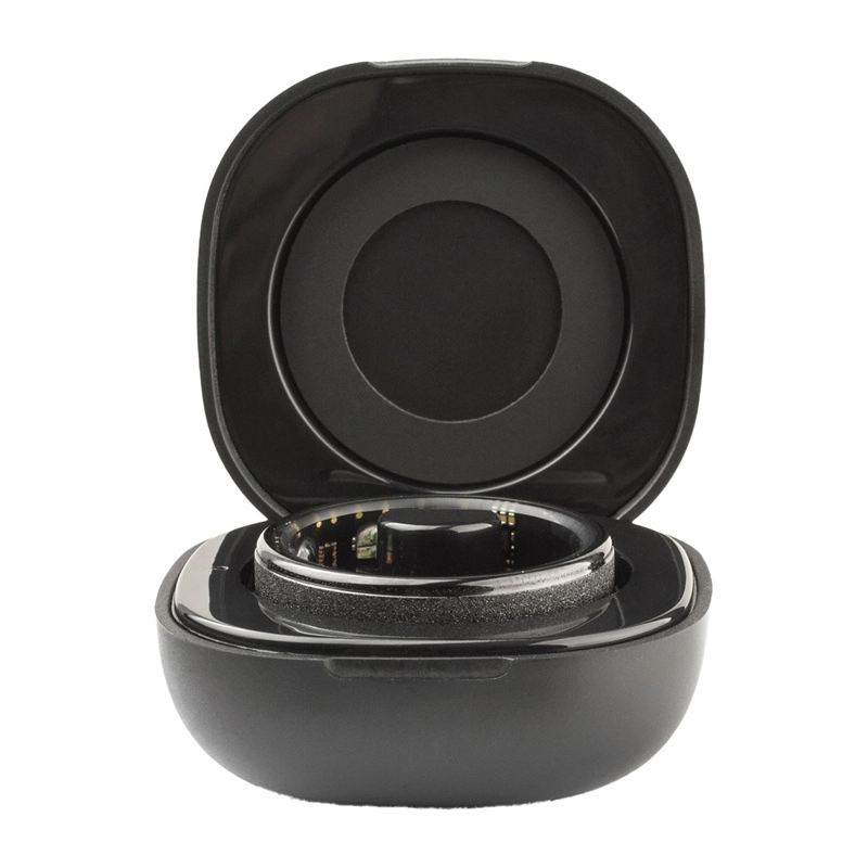 Det kompakte etui med 200 mAh kapacitet oplader ringen op til 13× uden stikkontakt. Selve ringen holder 3–5 dage og oplades fuldt på cirka 1 time.