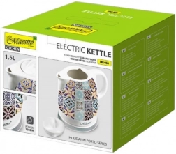 Den stilfulde keramiske elkedel MAESTRO PORTO med en kapacitet på 1,5 l og effekt på 1200 W opvarmer vand hurtigt og pynter køkkenet med et elegant blomsterdesign. Den tilbyder 360° drejelig base, indre maksimumsindikator, kabelopbevaring og belyst tænd/sluk-knap. For sikker drift har den automatisk slukning ved kogepunkt, overophedningsbeskyttelse samt tørkogningssikring.