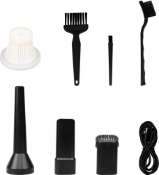 Til præcist arbejde i mørke kroge er der LED-lys. Den rige pakke omfatter flad sugedyse med børste, modsatspids til blæsning, 3 detailbørster og 2 vaskbare HEPA-filtre. Strøm fra det integrerede Li‑Ion-batteri giver op til 13 minutters kontinuerlig drift, opladning sker via USB‑C (kabel medfølger).