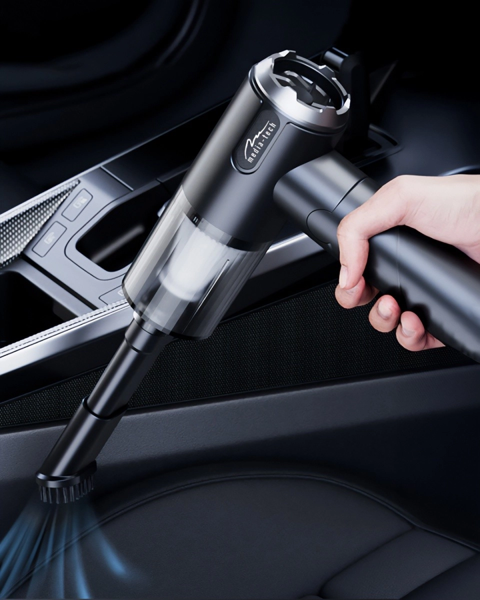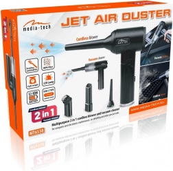 Kompakt og kraftfuld 2-i-1 blæser og mini støvsuger MEDIA-TECH JET AIR DUSTER til hurtig rengøring af elektronik, tastaturer, pc, bilinteriør og svært tilgængelige steder. Leverer kraftig sugning op til 6800 Pa, luftstrømshastighed 30 m/s, LED-belysning for bedre synlighed, USB‑C-opladning og et rigt udvalg af mundstykker og HEPA-filtre til alsidig brug derhjemme, på kontoret og i værkstedet.