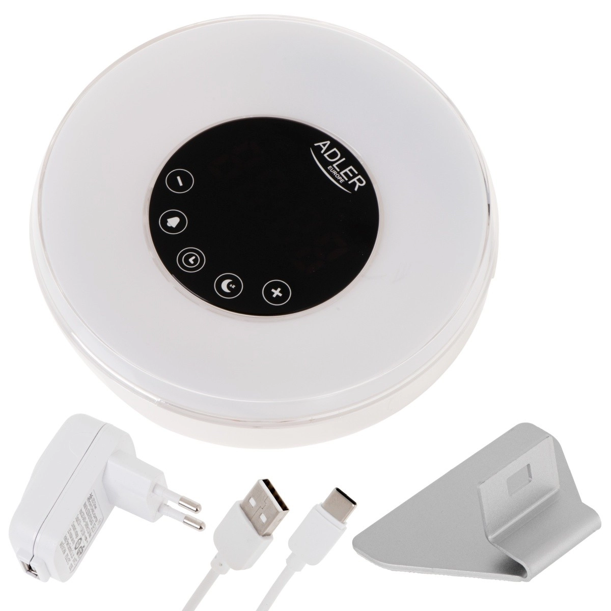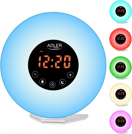 Om aftenen får du glæde af indsovningstilstand med trinvis nedtoning og timer på 15/30/60 minutter. Seks farvetilstande (blå, orange, indigo, lilla, rød, grøn) skaber en behagelig stemning og fungerer også som natlampe. Displayet har 4 lysstyrkeniveauer (høj/mellem/lav/slukket), så det ikke forstyrrer om natten.