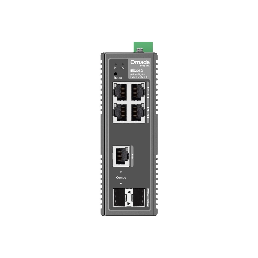 Den industrielle gigabit-switch OMADA IES206G tilbyder 6 netværksporte (4x RJ45, 1x combo RJ45/SFP, 1x SFP), central cloudstyring og robust IP40-design for pålidelig drift under krævende forhold. Understøtter VLAN, QoS, STP/RSTP, fungerer ved temperaturer fra -40 til 75 °C, har 6 kV overspændingsbeskyttelse og redundant strømforsyning 1+1.