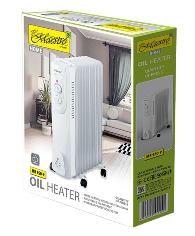 Kompakt og kraftfuld oliefyldt radiator Maestro MR-950-9 leverer hurtig og jævn varme i hjemmet og på kontoret. Takket være 3 effektniveauer (800/1200/2000 W), 9 varmeribber og en justerbar termostat opnår du nemt den ideelle temperatur. Driftsindikatorer og hjul for let flytning sikrer komfortabel og sikker brug.