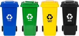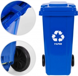 Praktisk sæt med fire farveopdelte containere med et volumen på 4×120 l til overskuelig affaldssortering: papir, glas, plast/metal, restaffald. Fremstillet af UV‑bestandig HDPE, med gummihjul på stålaksel, ergonomiske håndtag og tæt låg mod regn og lugt. Stabiliteten øges af skridsikre fødder. Velegnet til både husholdninger og virksomheder, kompatibel med kommunale systemer EN‑840 og certificeret ISO9001/14001/45001.