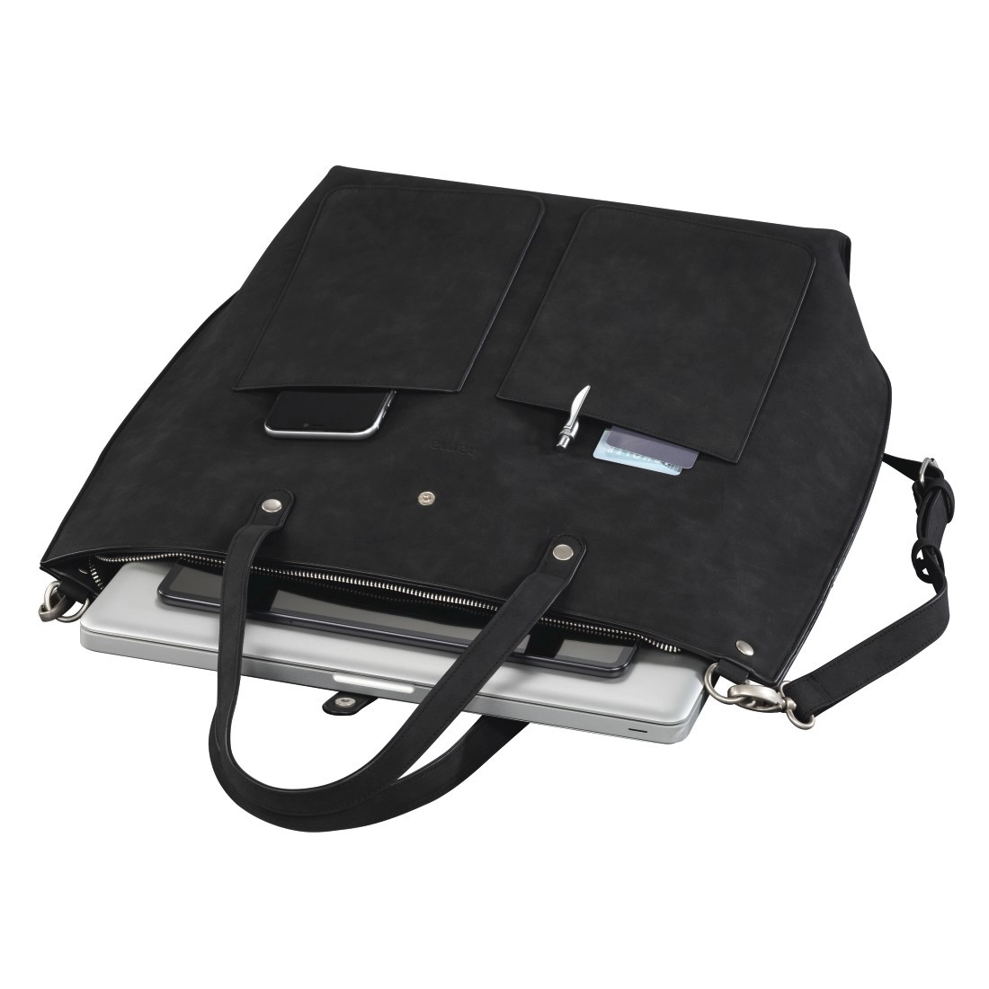 Hovedrummet rummer en polstret lomme til laptop 13,3–14,1″ med velcro-fastgørelsesrem, et separat rum til tablet op til 28 cm (11″) og en praktisk organizer til tilbehør. Den aftagelige, længdejusterbare skulderrem sikrer komfort, selv på travle dage.