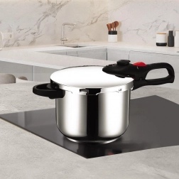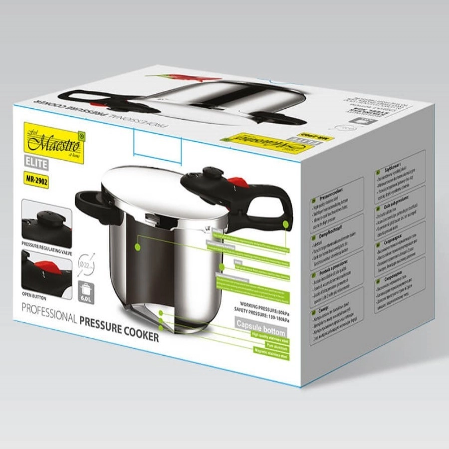 Denne trykkoger er en ideel hjælper til hurtig tilberedning af supper, gryderetter og kød. Takket være kapaciteten på 6 liter kan du nemt lave portioner til hele familien. Det kvalitetsrige rustfrie stål sikrer lang levetid, nem rengøring og et vedvarende flot udseende.
