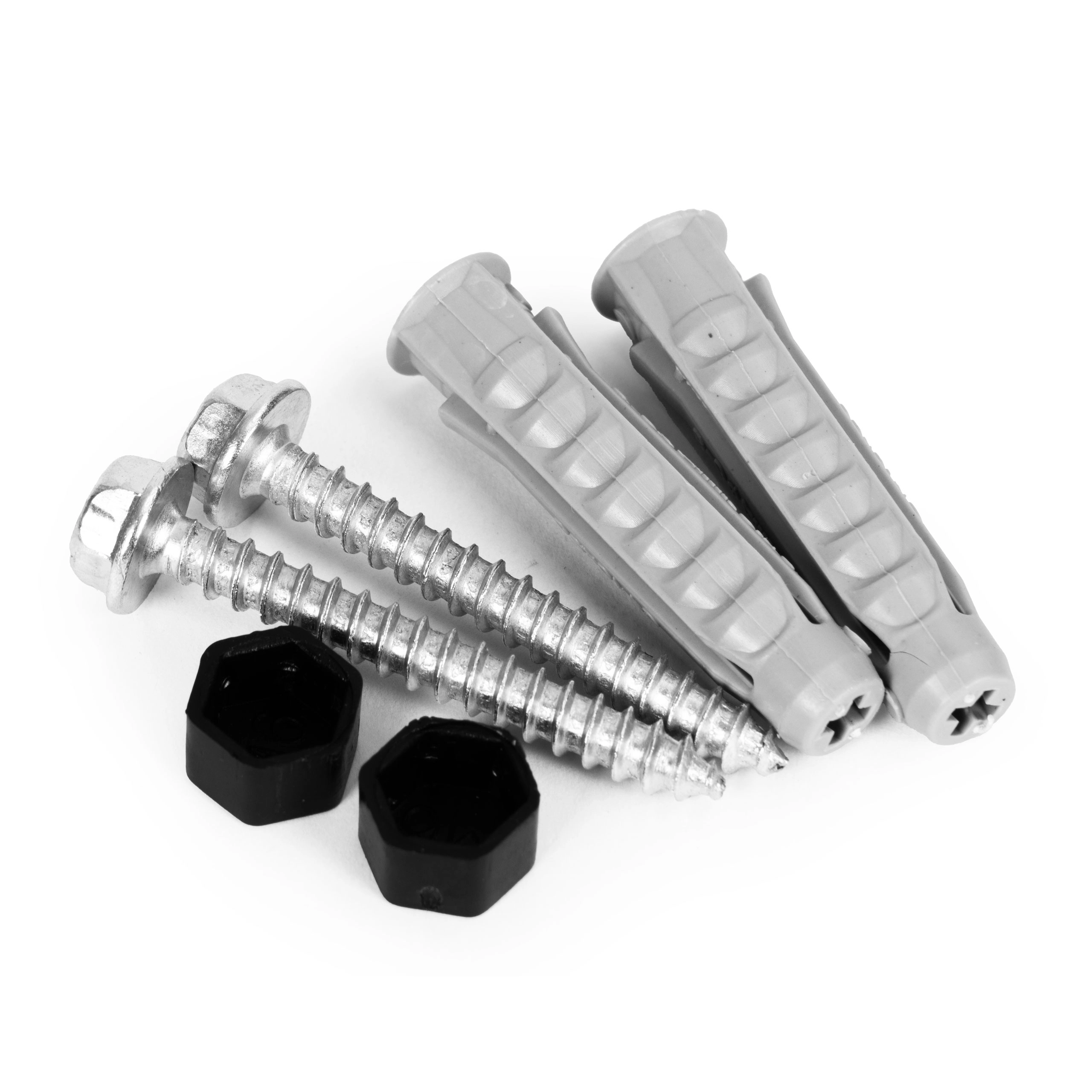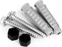 Pakken indeholder skruer, rawlplugs og dækkapper. Forborede huller i rammen sikrer fast forankring og stabilitet op til 5 kg.