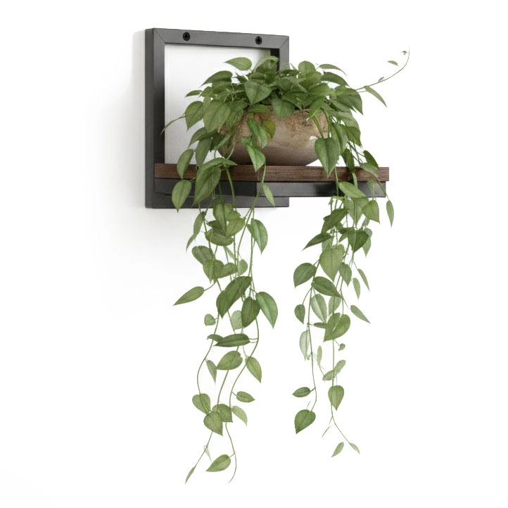 Stilfuld hængende plantehylde i industriel loftstil med kompakte mål og solid konstruktion. Kombinerer pulverlakeret stål og en hylde i trædekor af spånplade (DTD), tilbyder nem vægmontering og bæreevne op til 5 kg. Ideel til stue, køkken og badeværelse for pladsbesparelse og dekorativ fremvisning af planter.
