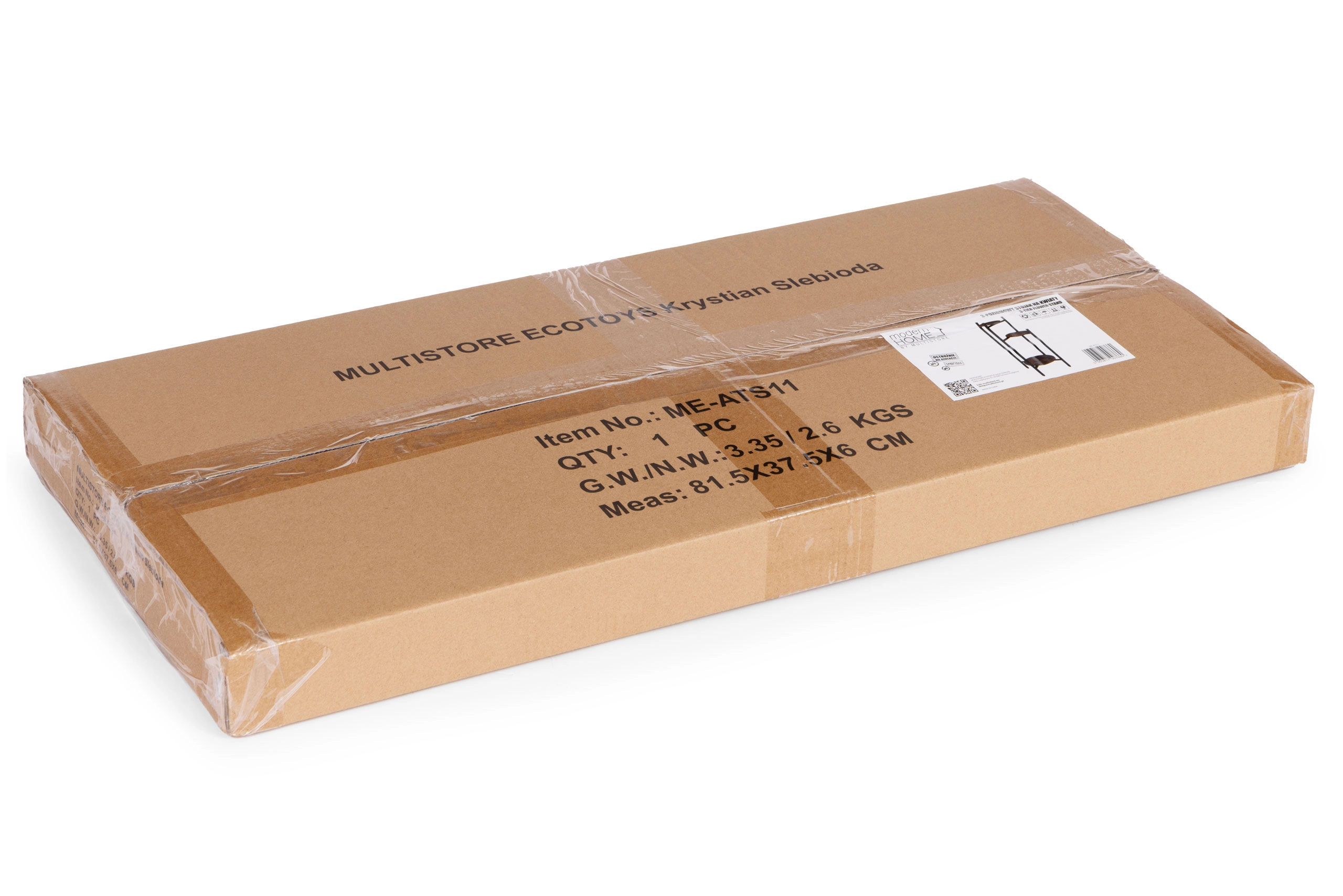 Konstruktionen i pulverlakeret stål sikrer modstandsdygtighed over for korrosion og slitage, mens de runde spånpladehylder i trædekor tilfører varme og karakter. Skridsikre fødder beskytter gulvet og øger stabiliteten, så standen også egner sig til områder med trafik.