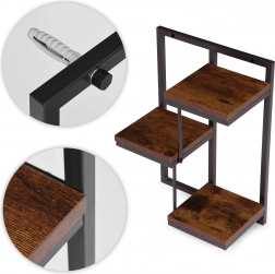 Den robuste stålkonstruktion med pulverlak modstår både korrosion og mekanisk slid, mens hylder i lamineret spånplade i trædekor understreger det elegante udtryk. Et gennemtænkt monteringssystem med forborede huller samt medfølgende rawlplugs og skruer sikrer stabilitet selv ved højere belastning.