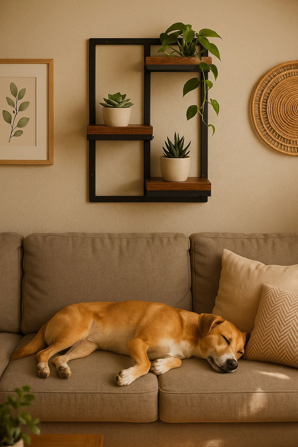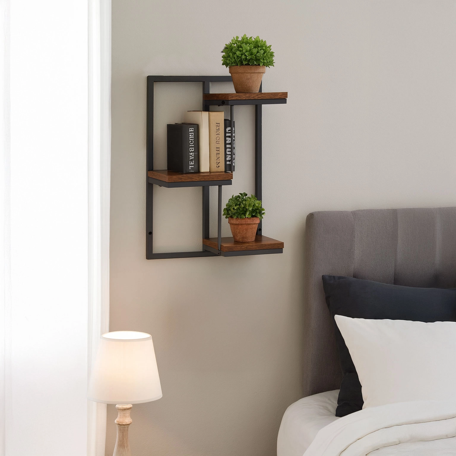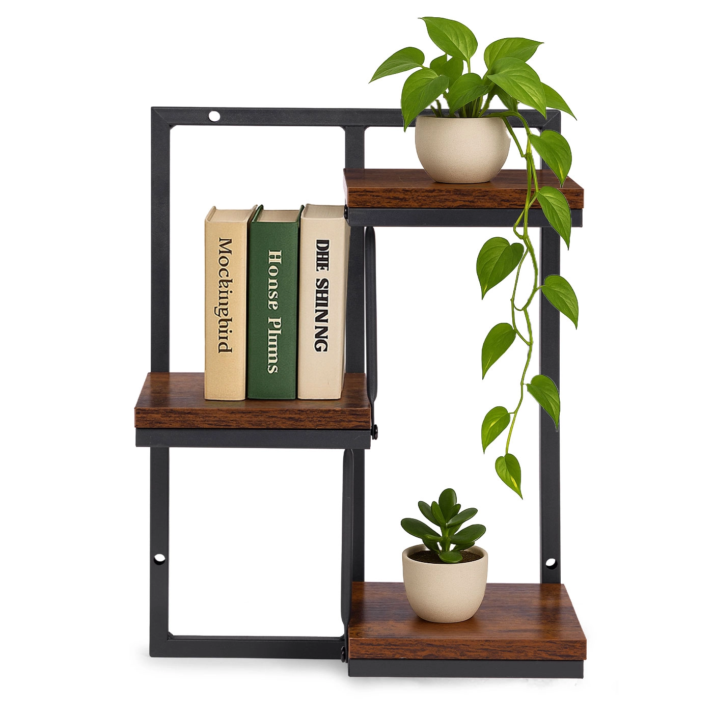 Tre hylder i forskudt arrangement giver rigelig plads til krydderurter, sukkulenter og dekorationer uden at optage gulvplads.
