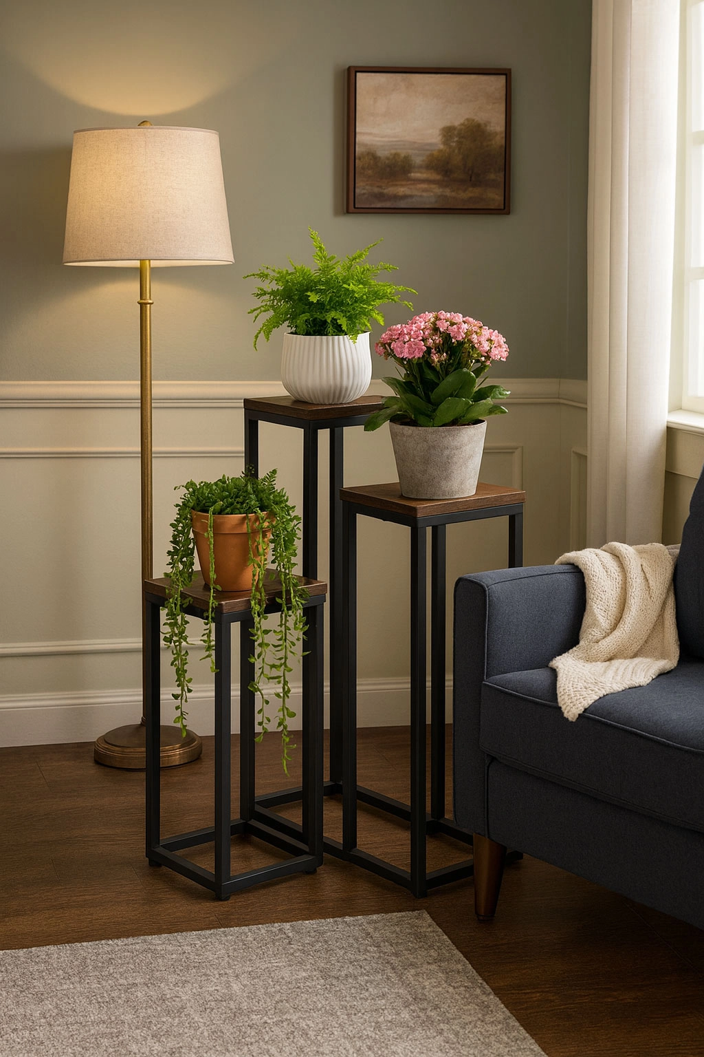 Tre praktiske hylder gør det muligt at udstille både urter, sukkulenter og hængeplanter i forskellige højder. Skab en kompakt, overskuelig og dekorativ grøn væg uden at optage unødig plads.
