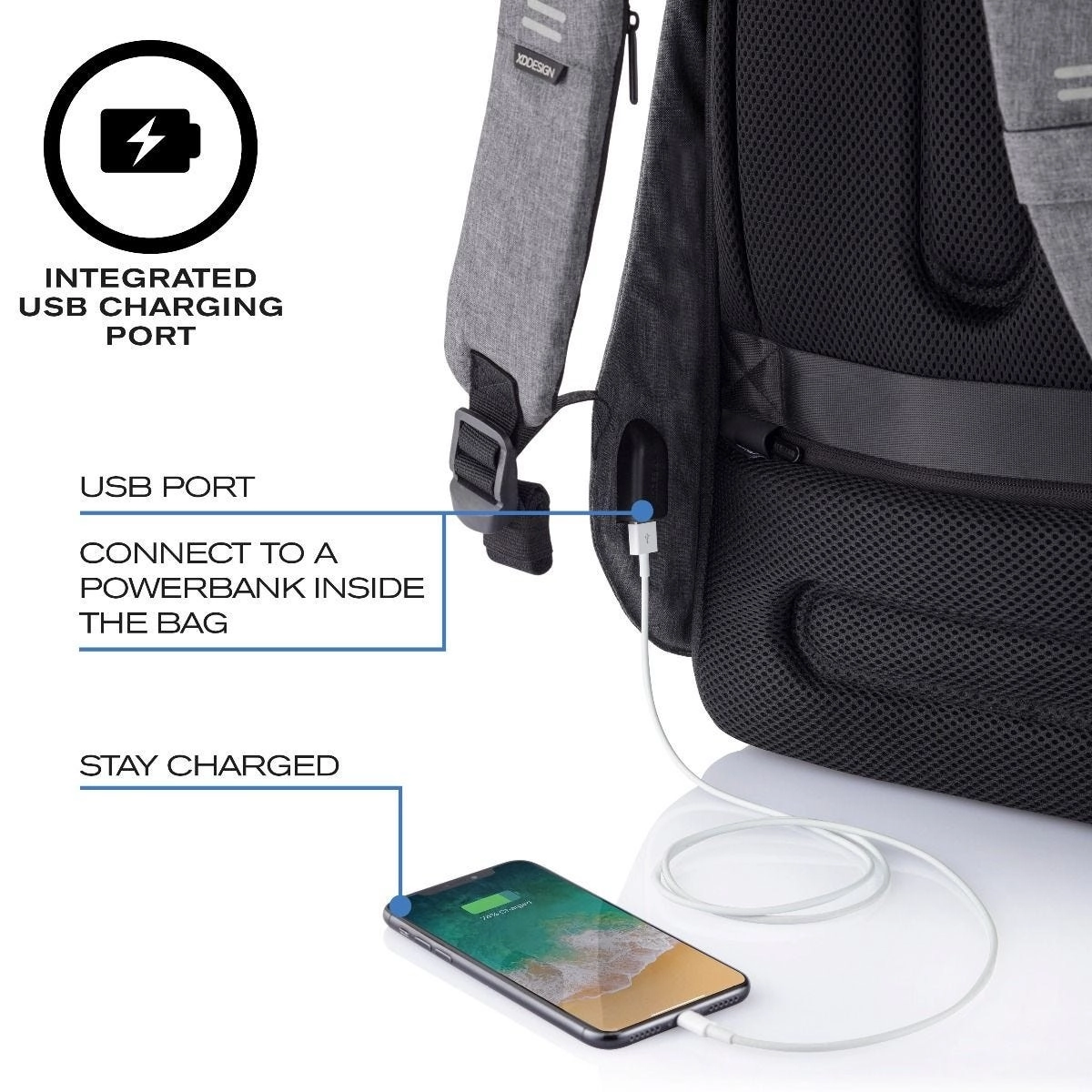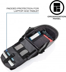 Indeni finder du et smart organiseringspanel med fleksible netlommer, polstrede rum til bærbar op til 13,3" og tablet op til 12,9", samt en praktisk USB-port til opladning på farten. Ergonomiske, justerbare skulderstropper, åndbart rygpanel og rem til fastgørelse på teleskophåndtaget på kufferten sikrer komfort. Der er også brilleholder på stroppen og reflekterende detaljer for bedre synlighed.