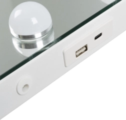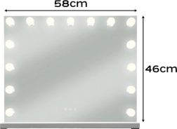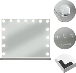 Elegant LED-kosmetikspejl Soulima 58 × 46 cm kombinerer HOLLYWOOD-stil med professionel belysning. 15 energibesparende LED-pærer, berøringspanel med trinløs lysdæmpning og 3 farvetemperaturer (varm, neutral, kold) skaber ideelle betingelser til makeup, hudpleje og hårstyling. Stor flade, mulighed for at stå eller hænge og dobbelt strømforsyning USB/230 V gør det til et både praktisk og stilfuldt tilbehør til sminkebordet eller skønhedssalonen.