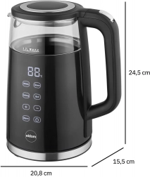 Denne moderne trådløse kedel kombinerer hastighed, præcision og sikkerhed. Med 13 temperaturtrin i intervaller på 5 °C tilbereder du hvid og grøn te, kaffe og instantdrikke præcis, som du foretrækker. Glasbeholderen giver overblik over vandstand og renhed, mens den isolerede plastikskal forbliver kølig at røre ved under brug.