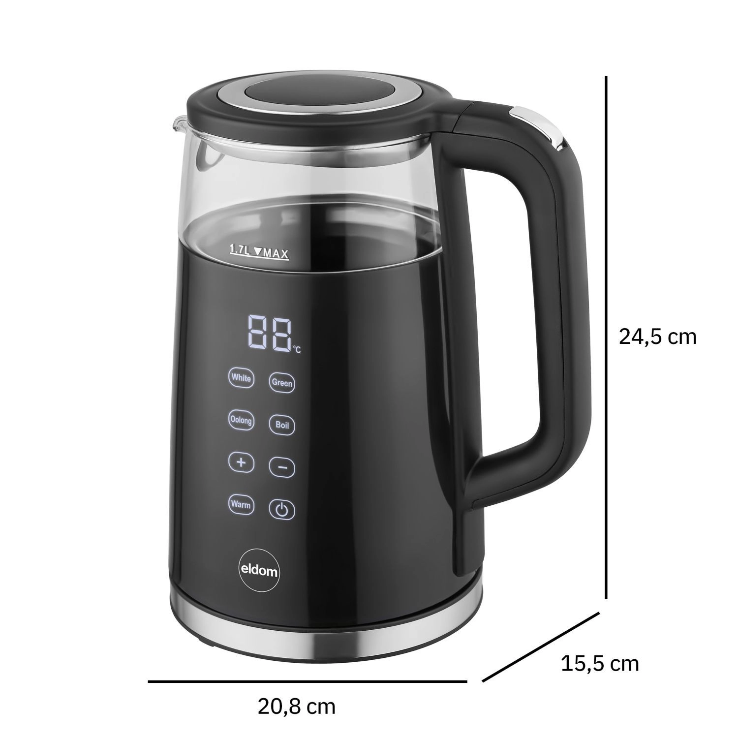 Vælg mellem 13 niveauer i trin á 5 °C og brug de 4 forudindstillinger (70/80/90/100 °C). Tilbered hvid, grøn og oolong te samt kogende vand med et enkelt tryk.